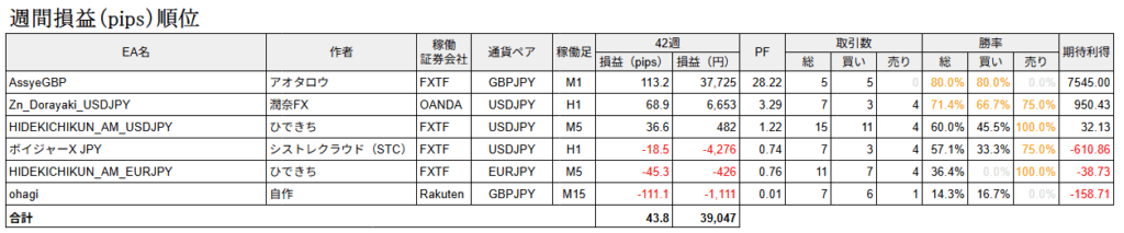 さて、今週のEA運用はプラス着地となりました。アオタロウさんのAssyeGBPが頑張ってくれましたね!