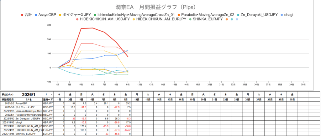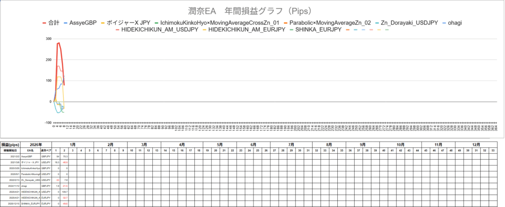 さて、2026年のEAの出だしは好調です!今週はAssyeGBPがよく稼いでくれました!こういった値動きがぐわっと起きた時に大きく取ってくれることが多いのでいいですよね!