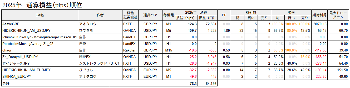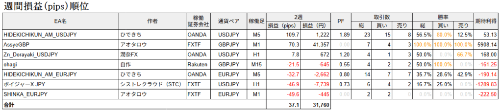 pipsではHIDEKICHIKUNのUSDJPYが多く取る事が出来ました。こちらは昨年の導入したタイミングが悪かったのか不調気味でしたのでロットを低く設定していますが、調子を見て調整していけたらと思います!