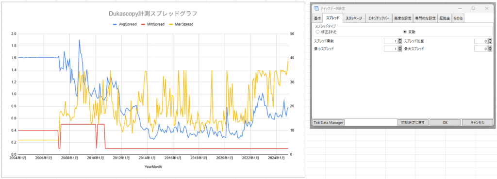 まぁちょっと説明すると、Dukascopyのティックデータを使っていますが、変動の初期設定でバックテストすると以下の画像のスプレッドが計測出来ます。