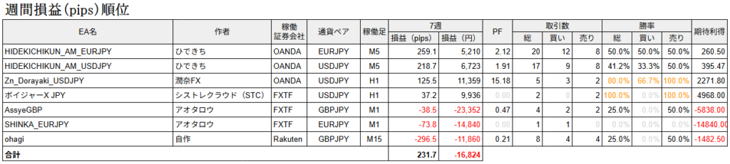 今週のEAは損益の動きが大きい週となりました。HIDEKICHIKUNのUSDJPYとEURJPYは週明けに大きく取って、金曜日に大きく負けました。それでも週明けの勝ちの方が大きかったのでプラスで着地する事が出来ました。