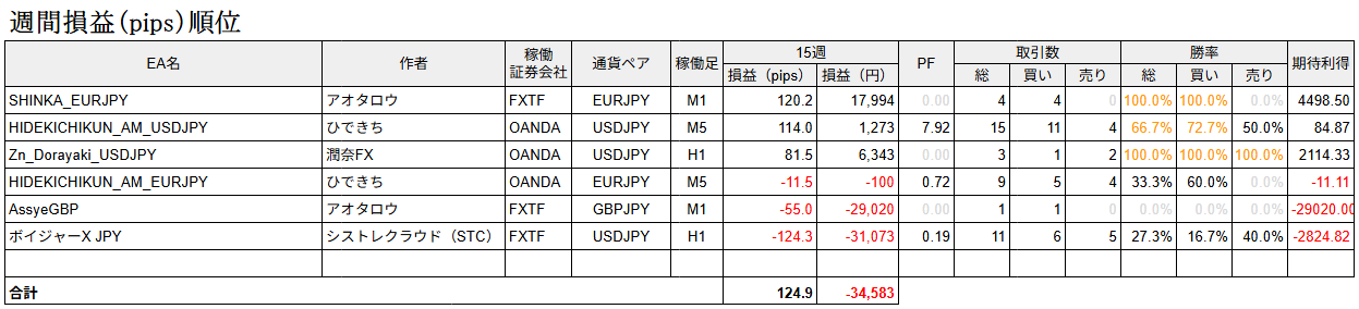 今週成績が良かったのはアオタロウさんのSHINKA_EURJPYでした!今年の年間世隻もプラスなので順調ですね。